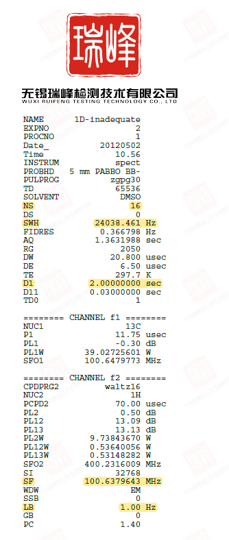 SWH:碳的信号范围一般在-20-220ppm。由于碳的激发频率在400MHz核磁上为100M,因此谱宽换算成HZ为240×100=24000Hz。这一数值可以根据特殊样品,要求核磁操作人员进行调整。