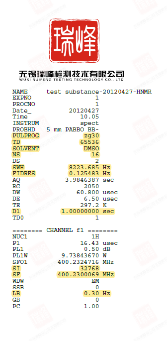 NS:重复扫描次数。氢核灵敏度高,一般情况下扫1次结果就很好了。如果你的样品很少或者溶解度很差,你可以要求核磁人员增加扫描次数,当然这需要付出额外的扫描时间。谱图信噪比正比于扫描次数的1/2次方。