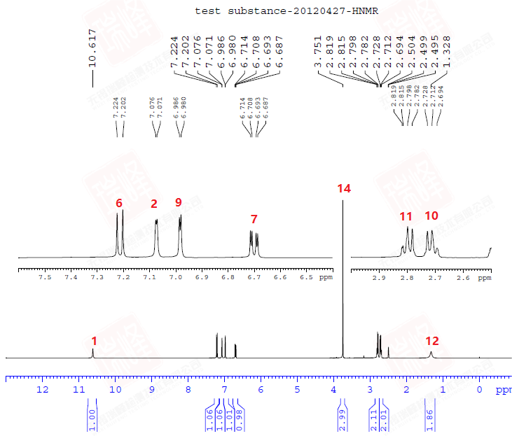 如果是初学者,可能大致就归类到这样。而10和11,2和9以及6和7具体归属也许并不好作判断(事实上由于7为dd,9为d,可以通过计算耦合常数讲7与9进行确定,与此同时6与2也确定下来了,但10与11的归属有一定难度,从谱图来看,10的峰型比11略为宽,由于N的核四极矩影响,与N直接相邻的CH2一般会略宽一些,然后之后的实验否定了这个结果,下面我会细说),而最低场的活泼氢是NH的。