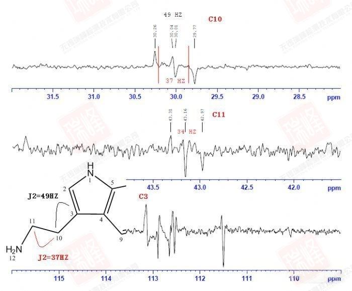 大家或许还记的之前在H归属中对于H10以及H11的归属曾经一度出现困难——HNMR中14N核四极矩造成的展宽以及H-N HMBC中相关信号的强弱都支持将高场H定为H11,但HMBC,COSY都明确给出了与之相反的结论。其实从C-C角度上来看这个问题会简单很多——C11仅受C10耦合,而C10却要受到C11和C3的耦合作用。图一中C10能明显读出49Hz的耦合作用,而红线标出的37Hz的反相位峰显得很弱,需要注意的是,在两个反相位双重峰中间位置出现的峰并不是三重峰,而是没有压制完全的13C单峰。图二给出的C11峰信号较弱,这可能是与之直接相连的14N所引起,34Hz的耦合值暗示着C10与C11的耦合关系。C3由于与C6与C7相互重叠,耦合变得难以辨认,使这一实验在解决C归属问题上不够严密,而我之后讲到的选择性1D-INADEQUATE将解决这个问题。