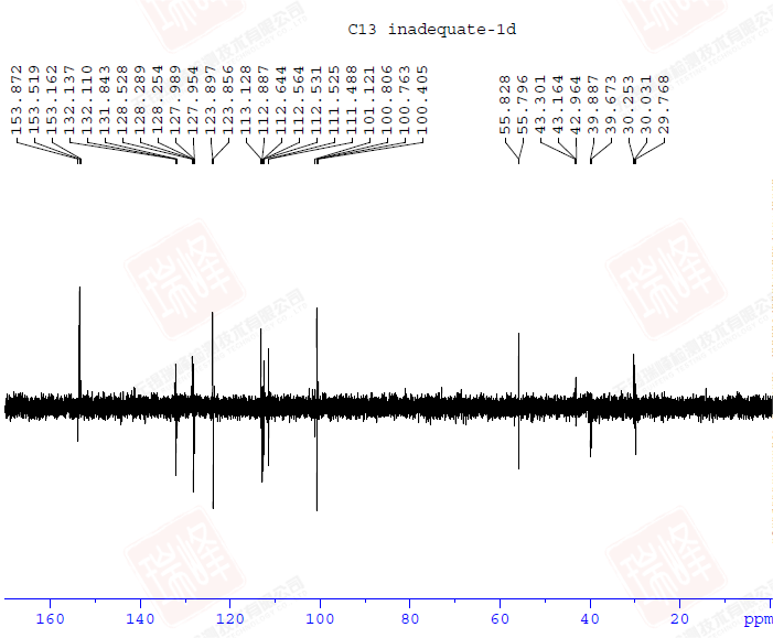 先给出这一结构的1D-INADEQUATE谱图。与2D相比,1D时间所花费的时间要少的多,但即使如此,这张谱图依然花费了我数小时的时间(还是在样品很浓的情况下)。由于脉冲演化的关系,1D-INADEQUATE实验中的信号常以反相位双重峰来呈现(其实稍微修改一下脉冲就可以实现相位同一化,但是我觉得这样反而不利于谱图解析),这是因为不管碳链多长,我们观察到的C-C相关通常就是一键相关(三个13C恰好相连的概率有多大?),而双重峰的波峰与波谷间距离是CC耦合常数,但遗憾的是,在1D-INADEQUATE中要分辨这一信号并不容易。