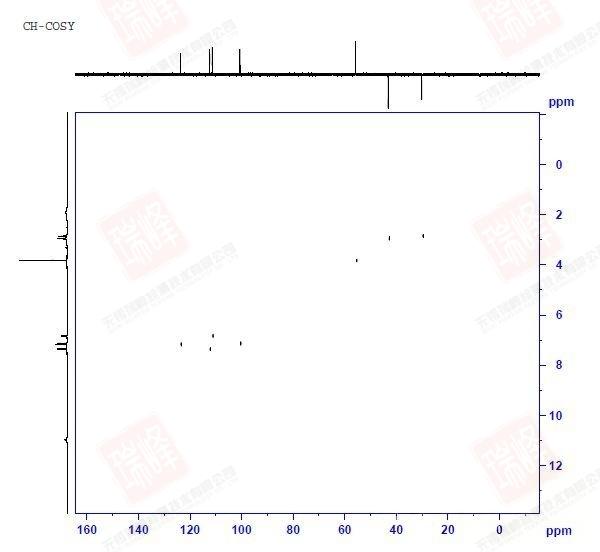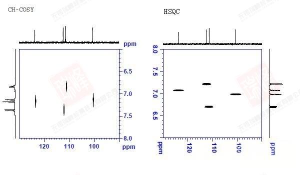 与H-H COSY不同,这一实验给出的是C-H直接相关的信息,类似于HSQC或HMQC。但与后者的区别在于,这一实验没有采用反向检测技术,直接采集的是C的信号,因此C维分辨率一般要好于HSQC,但却要付出更多扫描时间的代价。下面给出同一范围内的C-H COSY与HSQC谱图。