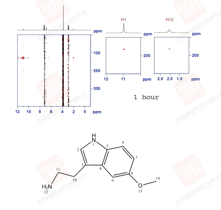 这一实验的魅力在于,利用反向检测技术,将不灵敏核15N的信息转移到灵敏核1H,极大地缩短了15N信号出峰的时间:通常而言15N谱所需要的样品浓度非常之高,而普通样品的15N谱花费数天甚至数星期都是很有可能的,但本实验只用了不到1h就得到了较为满意的结果 。由于N元素在有机物尤其是生物大分子中大量出现,这一实验在结构指认方面的重要性不言而喻。