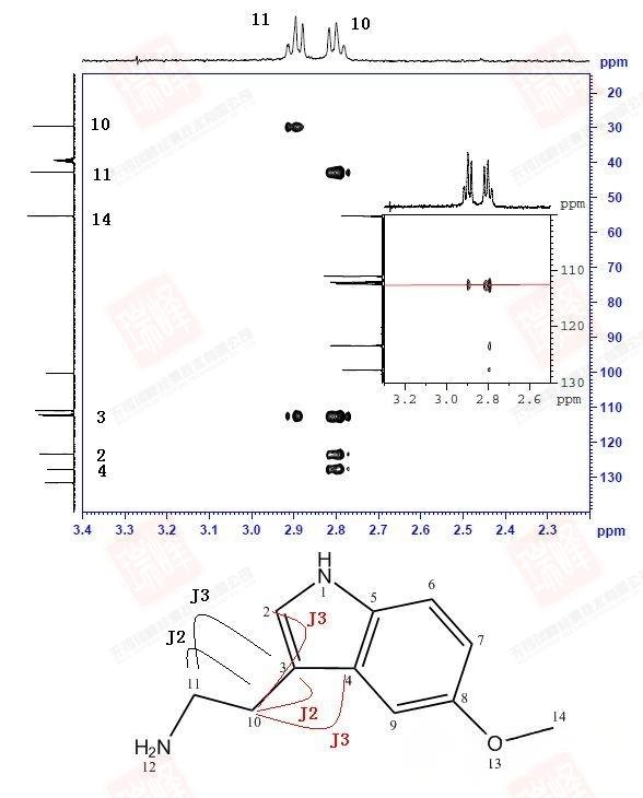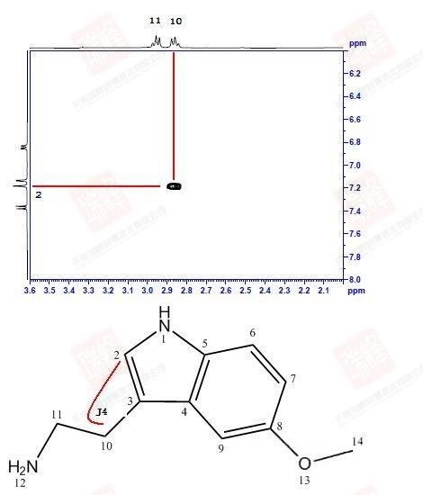 但NOESY要做成功并不容易。NOE效应与分子本身有关,一般在NOESY谱图中将对角峰调为正吸收,此时NOE信号在谱图上的正负取决于一个与分子运动状况相关的参数(慢运动条件下为正峰,快运动条件下为负峰),但尴尬的是当这一运动正好处在一个不快不慢的状态时,即使相隔很近的H之间也无法观察到NOE效应。由于分子运动状况常和分子大小相关,因此NOESY更适合于大分子和小分子,而我们最常遇到的中等分子信号增强往往很弱。不过,之后提到的ROESY实验可以克服这方面的问题。