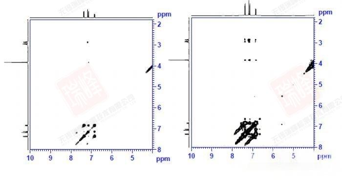 上图是在系统默认0.3秒混合时间以及优化后的1.0秒下所做谱图的对比。在将对角峰调到相近强度时可以看到优化后的谱图(右)交叉峰明显更强。