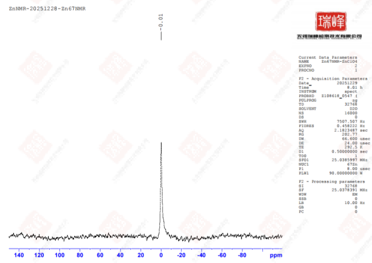 宽的化学位移范围与参考问题:⁶⁷Zn的化学位移范围极宽(超过1000 ppm),这有利于区分不同化学环境,但也对仪器的频率锁定和化学位移参照提出了挑战。通常使用0.1 M Zn(ClO₄)₂水溶液(酸性以防止水解)作为外标(δ = 0 ppm)。